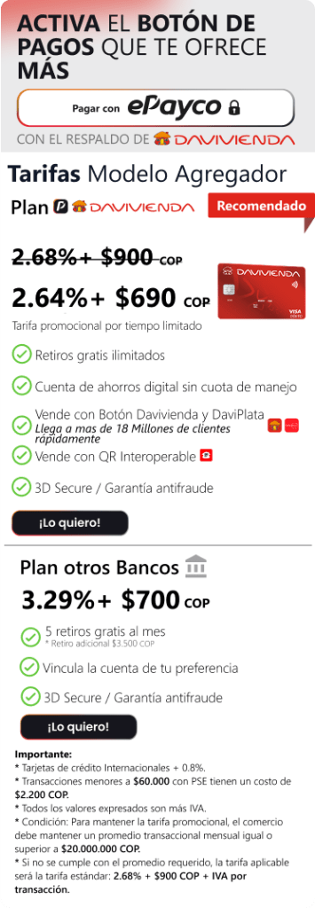 Ofrece a tus clientes diversos medios de pago y herramientas de cobro simplificadas de forma rápida y segura, no importa el tamaño de su negocio, ePayco se adapta a tus necesidades.